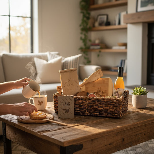 Each gift is built around a permanent, custom-engraved keepsake, such as our Small Bamboo Boards or our signature Medium Epoxy Resin Cutting Boards. We provide options for personalized client names, new addresses, and subtle brokerage logo placement on select wood items.