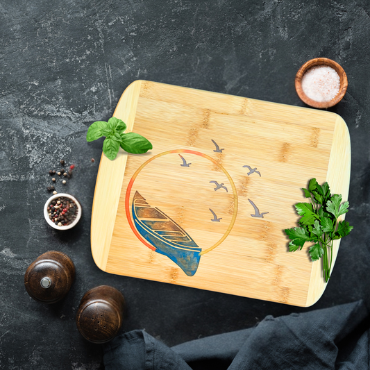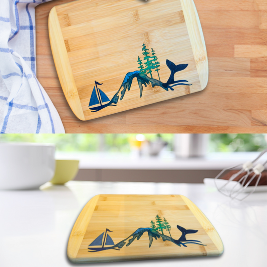 THE BLENDED OASIS - Bamboo Cutting Board - PNW Pacific Northwest Epoxy Resin Designs (Canoe) - Epoxy Resin Inlay