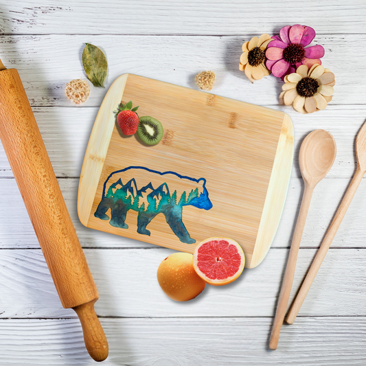THE BLENDED OASIS - Bamboo Cutting Board - Earthly Creations Epoxy Resin Designs (Mountain Bear) - Epoxy Resin Inlay