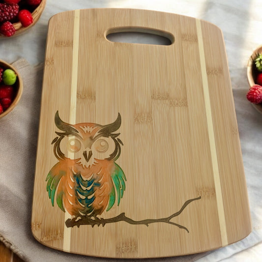 Bamboo Serving Cutting Board with Owl Epoxy Resin Inlay - 11 x 8.5 x .375 inches