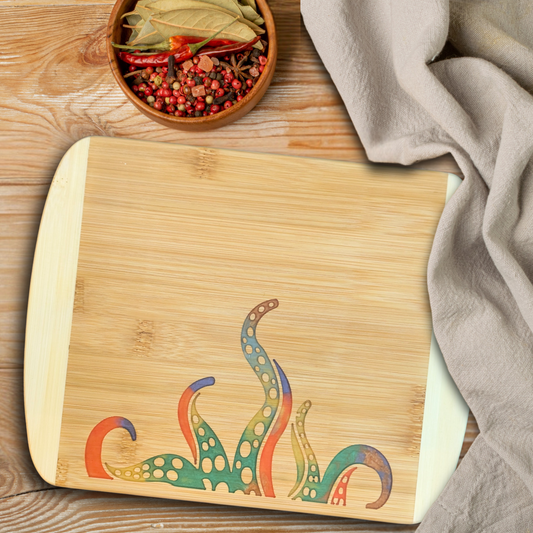 Bamboo Serving Cutting Board with Octopus Epoxy Resin Inlay - 13 x 10 x .625 inches