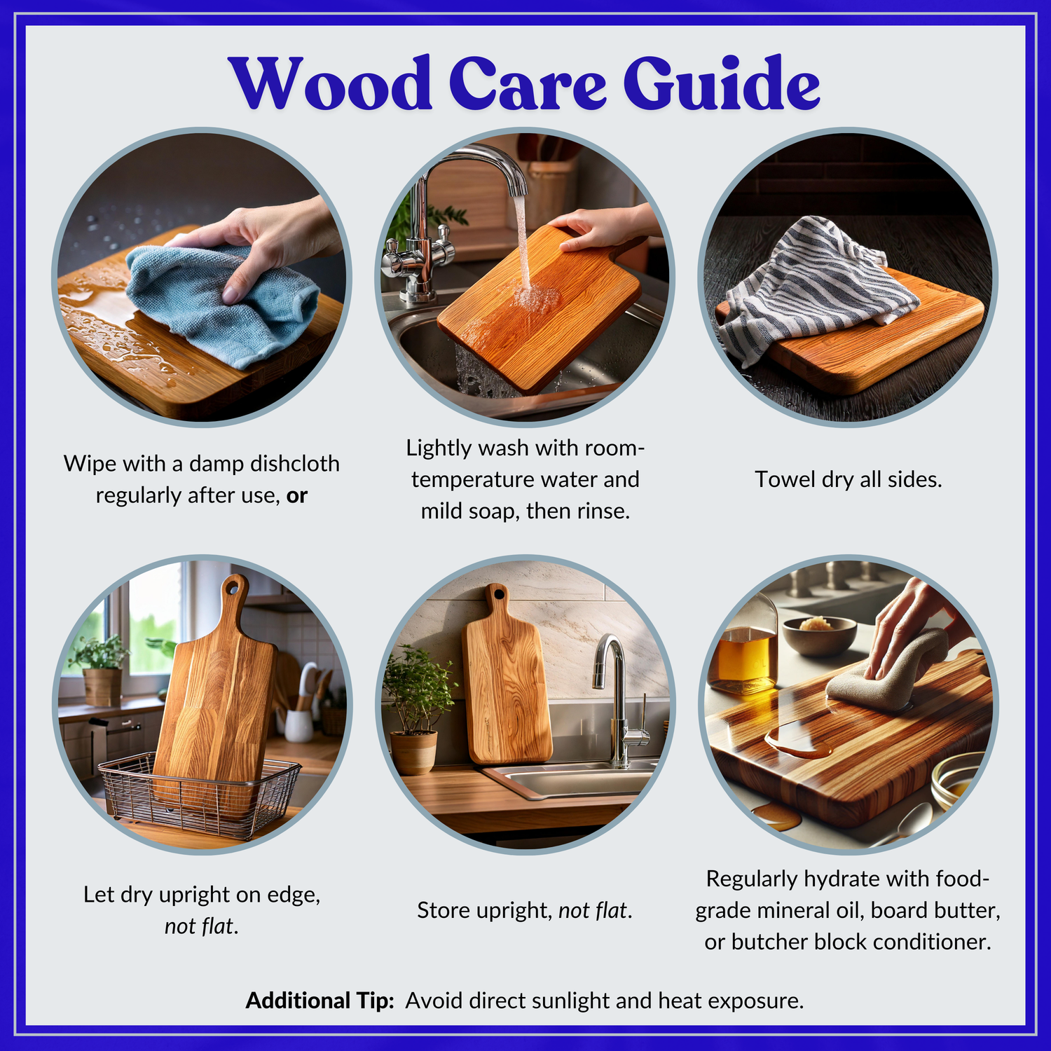 Welcome to our Care and Policies page! Here, you'll find everything you need to know about maintaining the quality of your cutting boards and kitchen utensils. You'll keep them in top condition with our care and maintenance tips. Proper upkeep is essential to prevent warping, splitting, or cupping, ensuring their longevity and reliable performance for years to come.