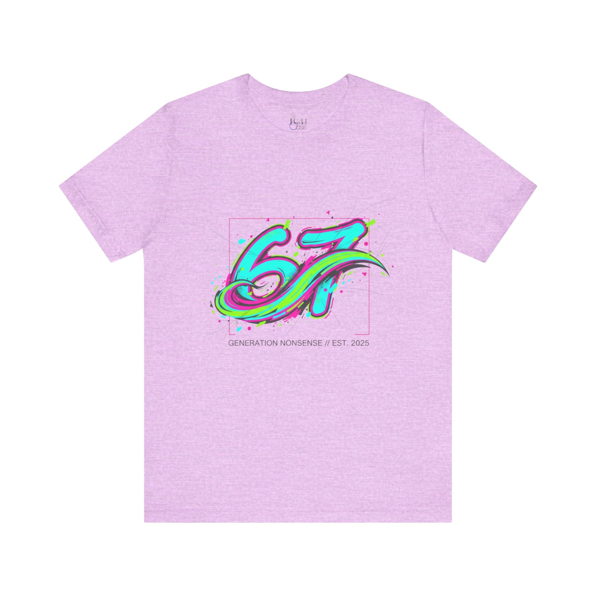 Graphic Tee! This shirt captures the spirit of bold, no-filter self-expression. Featuring a massive, neon-splashed '67' in a chaotic, graffiti-inspired style with the tagline 'Generation Nonsense // EST. 2025,' it’s a pure throwback to the wild energy of late '80s and '90s street art. The electric pink, lime green, and vivid cyan colors pop against the fabric, ensuring you stand out in the best way possible. Perfect for those who live loud and laugh at the rules."