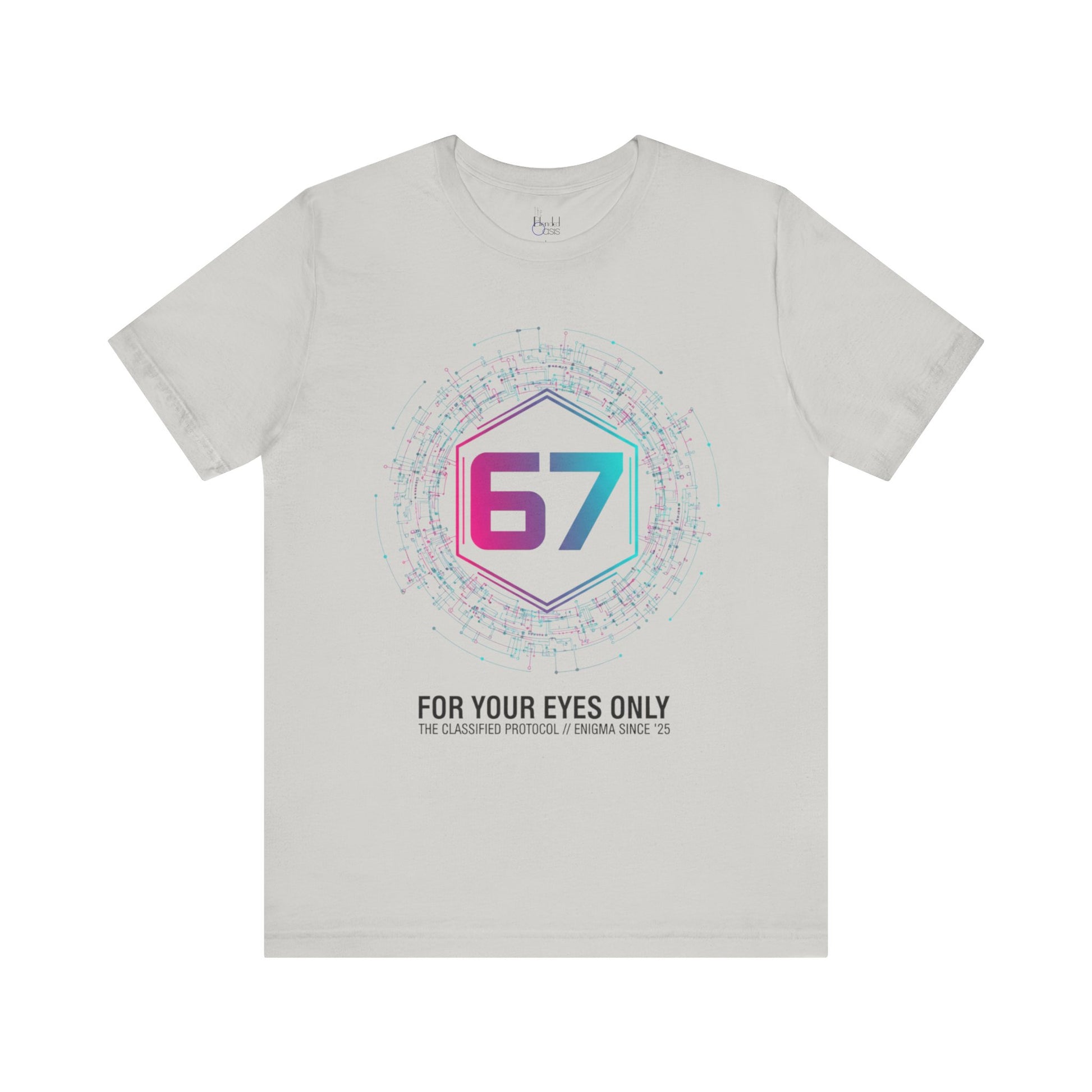A breathable, lightweight tee that speaks to fans of subtle cyber- and retro-tech style. The front features a hexagonal emblem with a colorful "67" at its center, surrounded by fine circuit-like detailing and the discreet line "FOR YOUR EYES ONLY" beneath it. The slim crew neckline and retail fit keep the silhouette clean and easy to layer—wear it under a jacket or on its own when you want a minimalist yet techy look. The soft Airlume combed cotton feel stays comfortable all day, while careful construction (ribbed collar, shoulder tape, side seams) keeps the tee looking sharp after repeated wear. It’s the kind of shirt that quietly signals someone who loves numbers, puzzles, or low-key sci-fi aesthetics without shouting for attention.