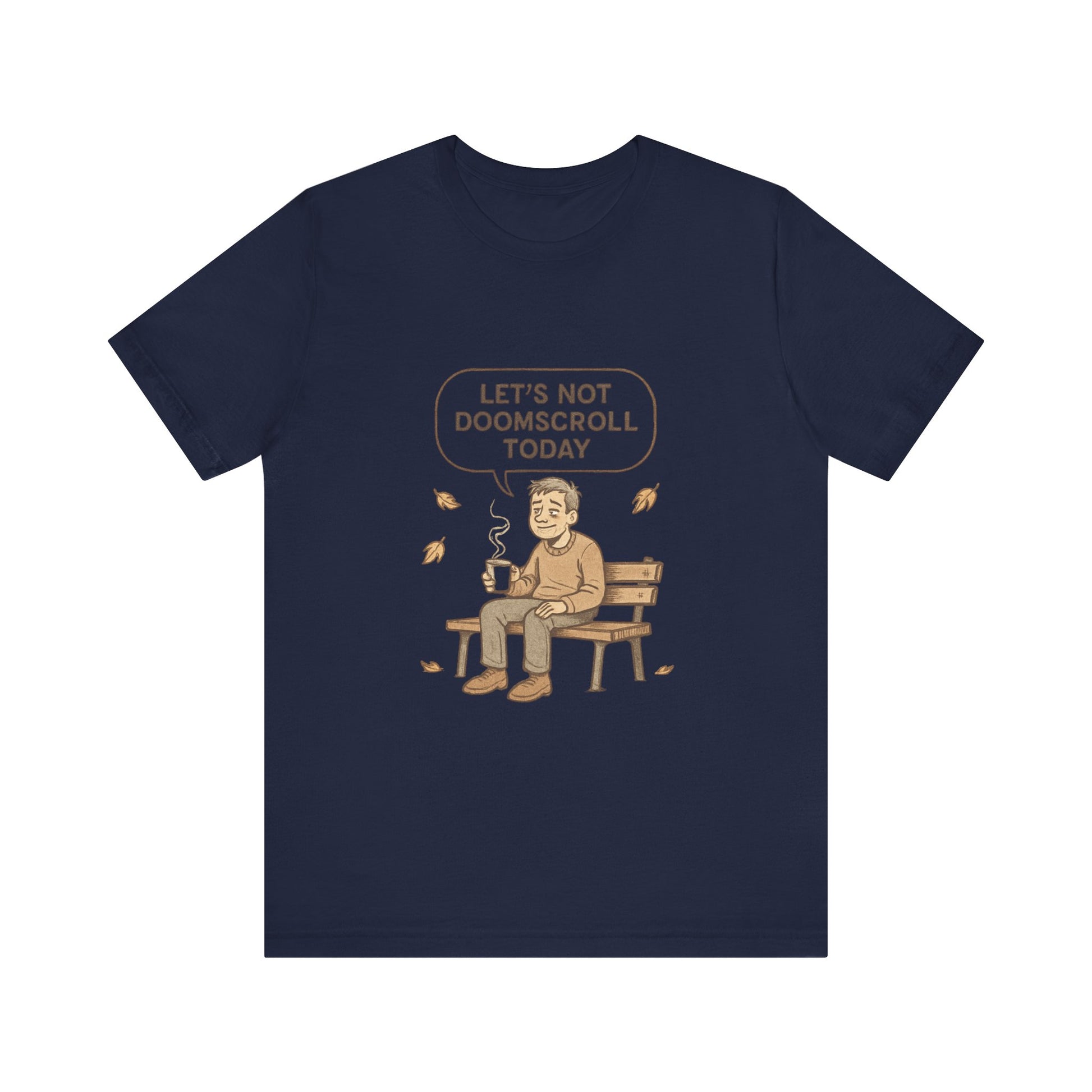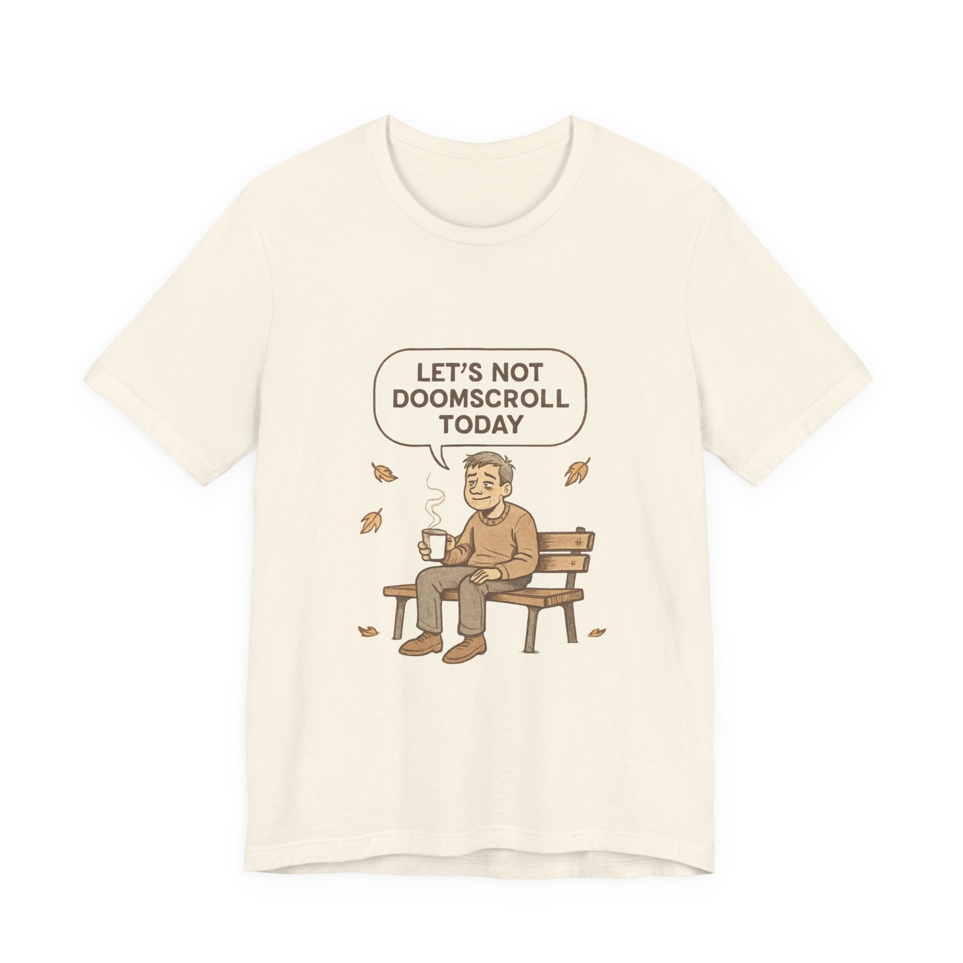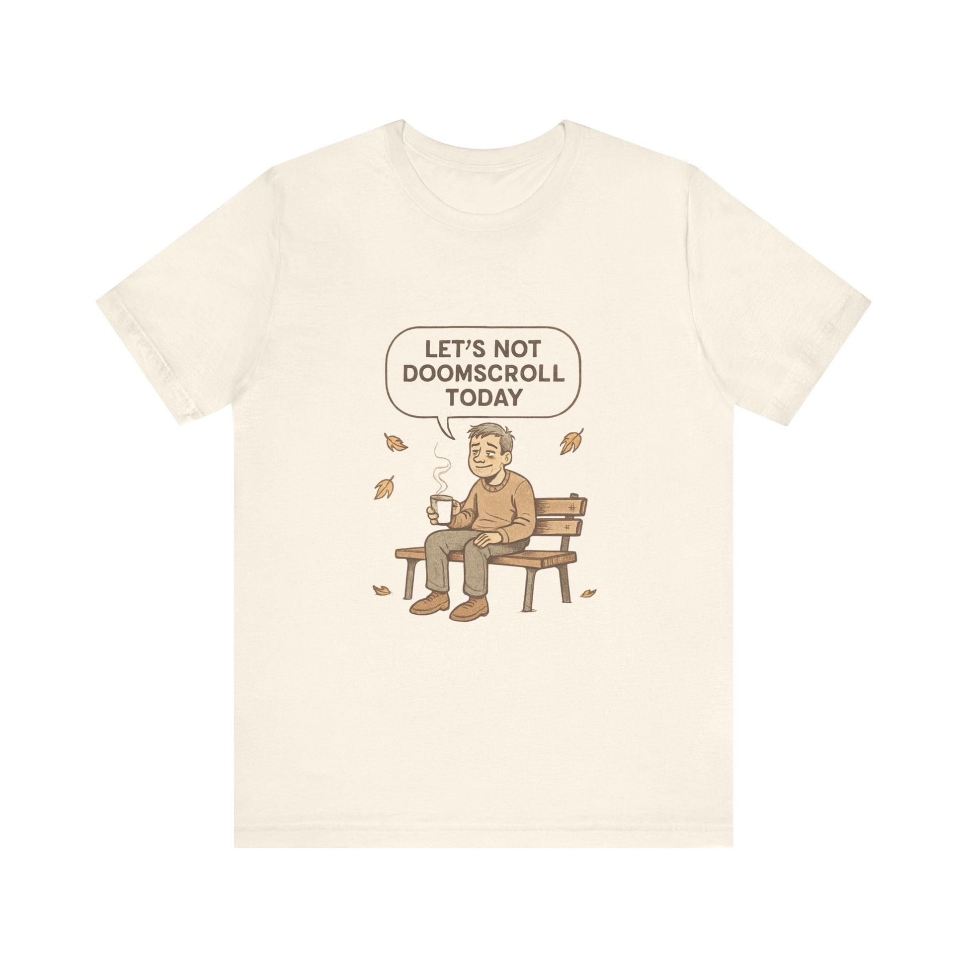 This lightweight cotton tee carries a quiet, human message — a simple illustrated moment of someone on a park bench, steaming cup in hand, with the speech bubble: “Let’s not doomscroll today.” It reads as a gentle permission slip to step away from the noise, breathe, and choose presence. Wear it on slow mornings, walks through the neighborhood, or when you need a low-key reminder to disconnect.